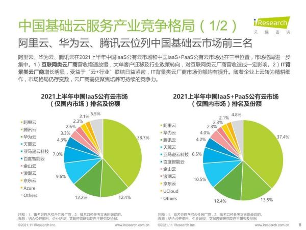2021年上半年,阿里云、华为云、腾讯云在2021上半年中国IaaS公有云市场和中国IaaS+PaaS公有云市场处在三甲位置,市场份额都在两位数以上,处于行业第一梯队。