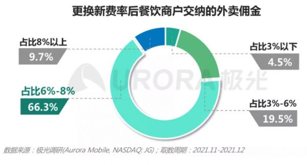 但是在费率改革实施以后,根据极光大数据机构刚刚发布的《2021 餐饮外卖商户研究报告》显示,超过 9 成商户缴纳的佣金,即技术服务费低于 8%,佣金在6%-8%的商户占比达到了66.3%。