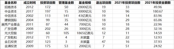 从2021年前十大活跃国资PE投资情况来看,中金资本、招商资本、中信资本以及建银国际依然稳居前四,无论是管理资金规模、管理基金数,还是2021年的项目投资数和投资金额上,手笔依旧。