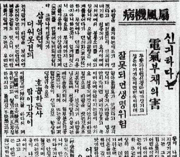 “风扇病——电扇的神秘危害,做错了会危及生命”[3],这篇标题看似玄幻的文章于1927年刊登在韩国的《中外日报》上。文章首次提出了风扇可能带来危害的观点:风扇旋转产生真空,这会导致坐在附近的人因缺氧而呼吸困难,从而引起头痛、面神经麻痹、窒息等症状。