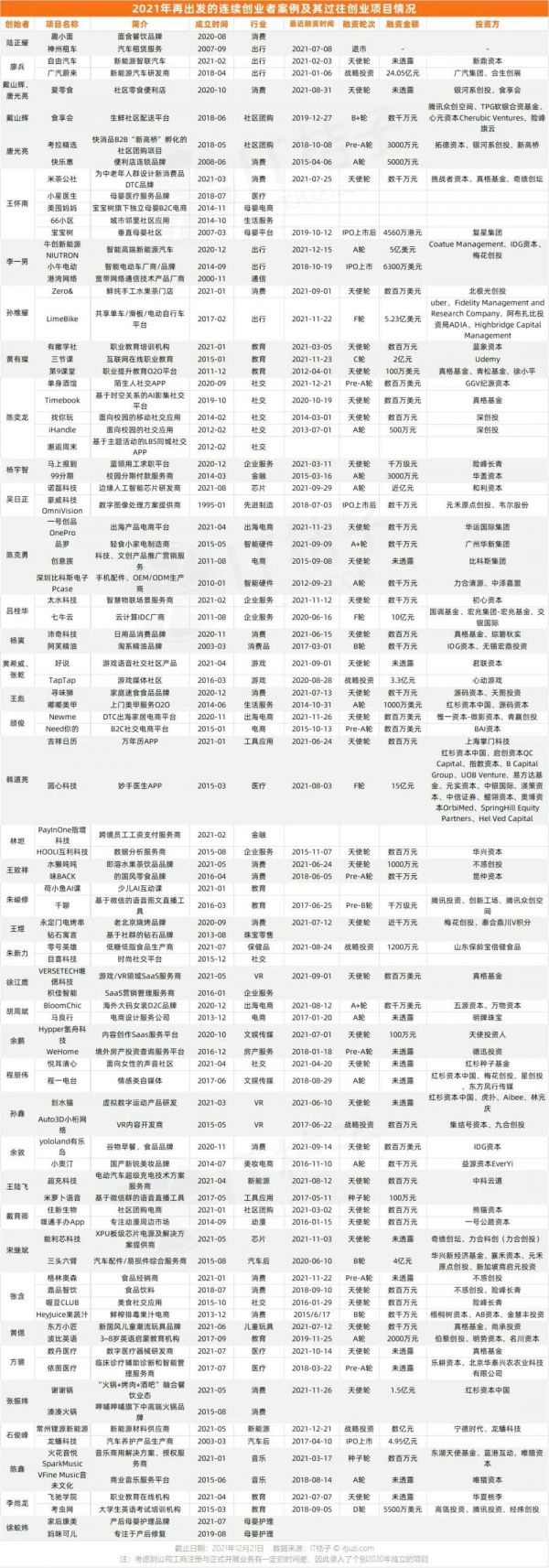 附录:2021 年再出发的连续创业者案例及其过往创业项目情况