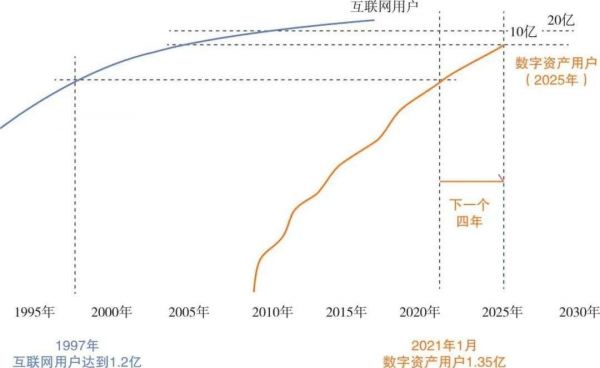 根据分析师威利·胡(Willy Woo)搭建的预测模型:到2025年,数字资产的用户数量可能会达到10亿人(相当于2005年的互联网用户数量),互联网渗透率将超过20%,这将使得数字资产有望正式跨越鸿沟,进入早期大众阶段(见下图)。