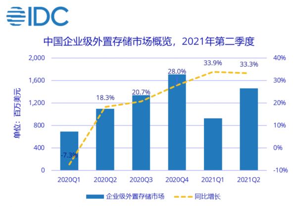 国际数据公司 (IDC) 发布的全球存储系统市场报告数据显示,全球外置存储市场从2021年一季度开始回温,在二季度得到更强增长,同比上升9.7%,市场规模达69亿美元;从存储阵列看,全闪存系统在二季度同比增长7.6%,总规模超过27亿美元。