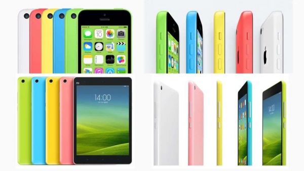 小米平板发布那年,其实 iPad 早就一统平板江湖了,当时正逢推出了 iPad mini,卖的非常火热,于是小米平板 1 也选择了和 iPad mini 一样 7.9 英寸屏幕,而且不止尺寸,两者的分辨率和屏幕比例也完全一致。另一个有意思的是,小米平板 1 的设计灵感明显来自于 iPhone 5c,它们不止有相同的聚碳酸酯后壳,就连配色和海报风格也非常相似,也许小米当时又意识到了别人的设计才是最好的设计。
