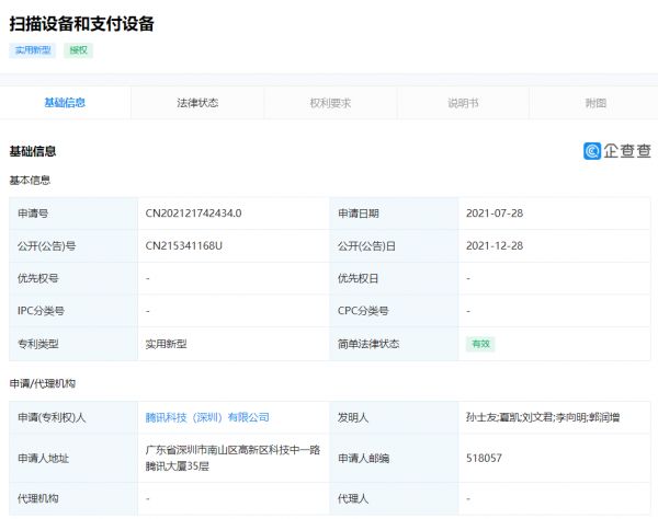12月28日消息,企查查网站显示,腾讯近日获得了“掌纹支付设备”相关专利。