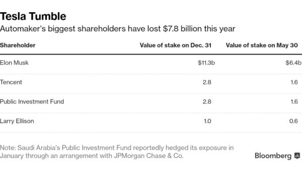 除了马斯克,特斯拉的另外三大股东腾讯、沙特公共投资基金(PIF)以及拉里·埃里森(Larry Ellison)持有的股份价值总计缩水29亿美元,这四大股东仅5月份就损失了27亿美元。特斯拉、腾讯和PIF均未回复置评请求。埃里森也拒绝置评。
