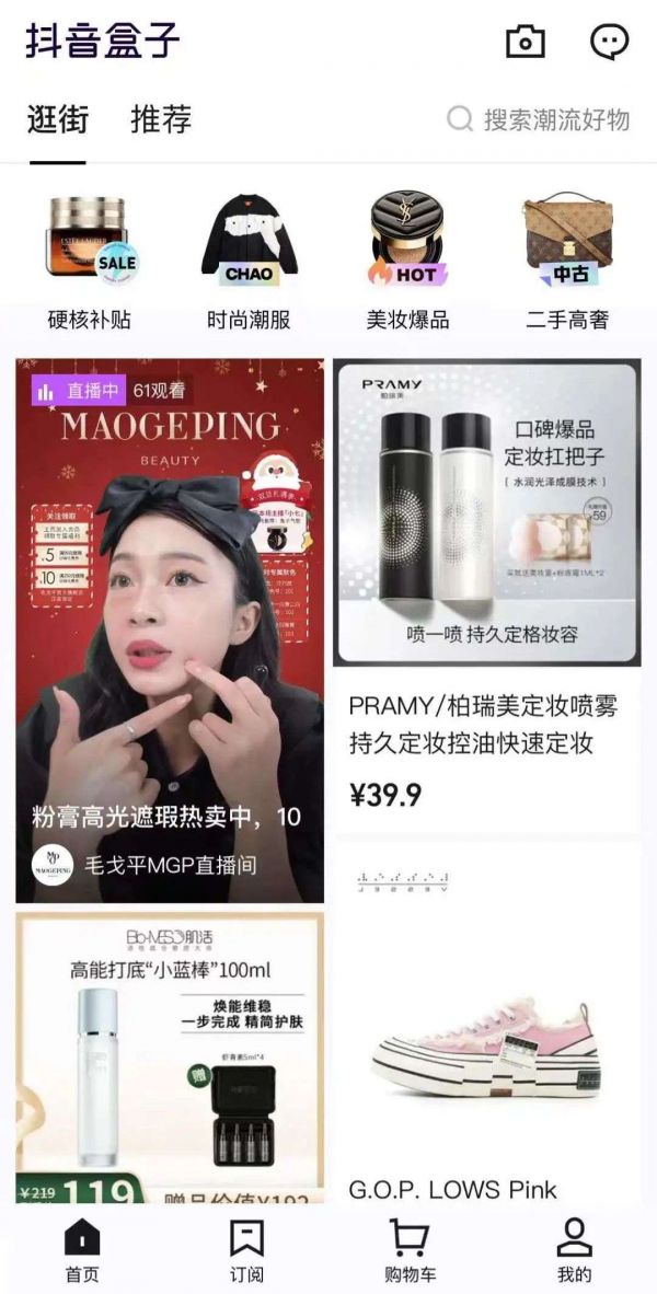 如果想要“拔草”,则要进入“逛街”入口,类似于淘宝的“逛逛”,页面布局接近小红书四格一页的错位布局,其中既有商品页面,也有直播页面;有硬核补贴、时尚潮服、美妆爆品、二手高奢四大类,潮服和美妆主打产品,从电商产品的丰富度上来说,主打垂直类需求,未必能满足消费者的泛在化需求。