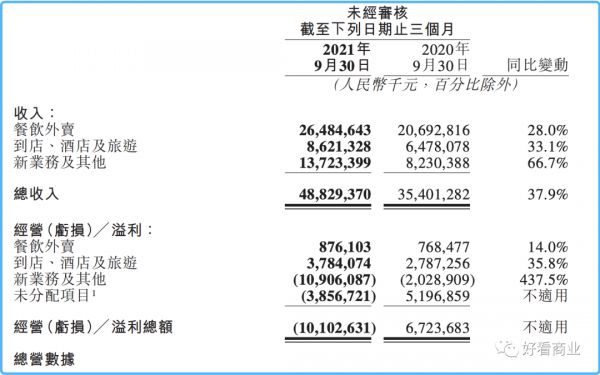 美团2021Q3营收、利润情况,来源:财报