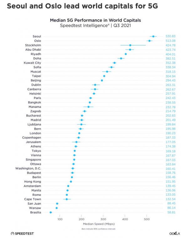 网速最高的城市TOP10分别是韩国首尔、挪威奥斯陆、瑞典斯德哥尔摩、阿联酋阿布扎比、沙特阿拉伯利雅得、卡塔尔多哈、科威特城、保加利亚索非亚、阿曼马斯喀特以及中国台北,北京排在第十一位。