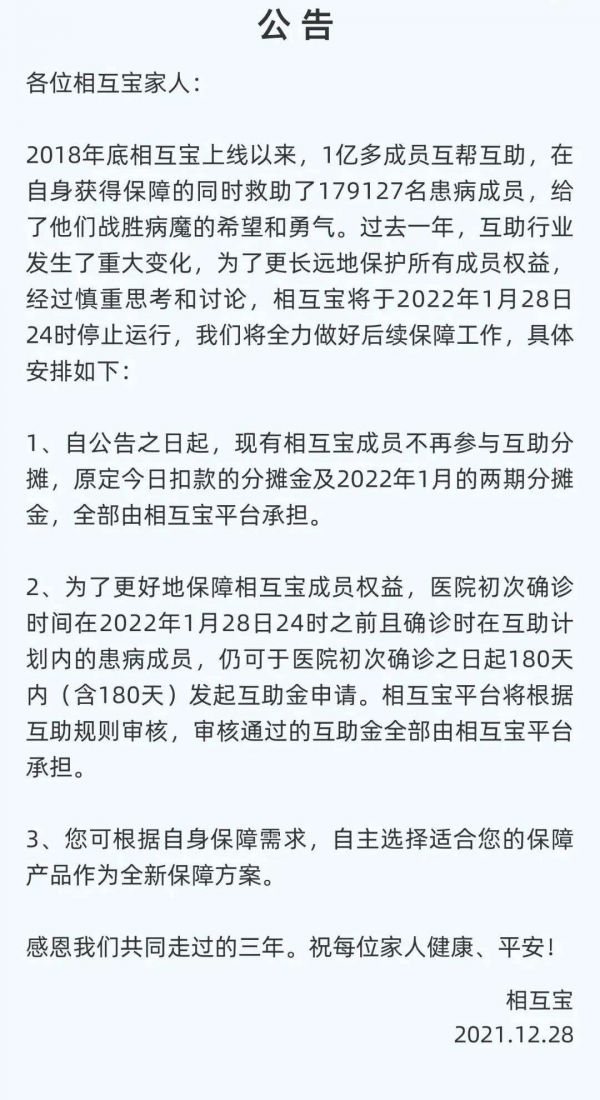 相互宝将于1月28日关停:即日起用户不再参与分摊,可自主选择全新保障产品