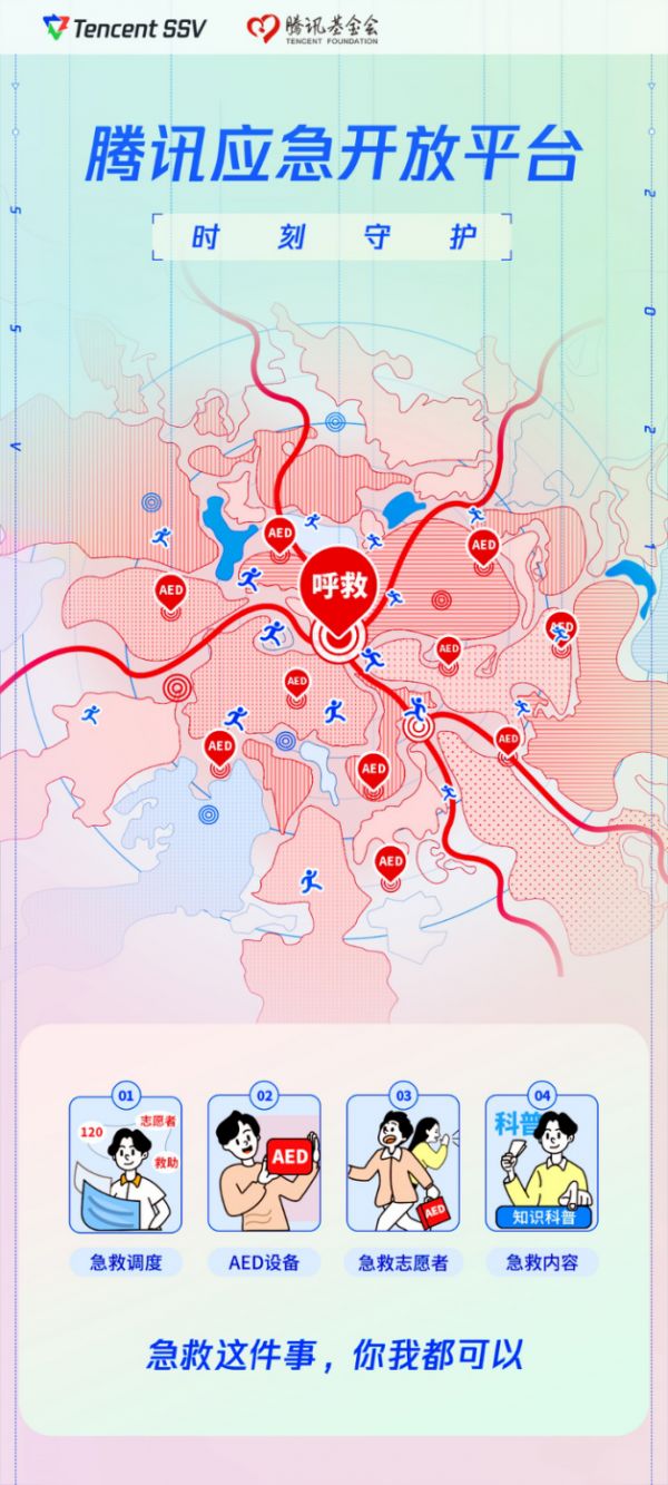 第一个是我们的急救互连小程序已经上线,目前还处于β版本。 已经开通了腾讯总部跟南京大学,后续会像前面所提的路径一样,一个个试点先开,后面一个个区域开,最后想办法推广到全国。