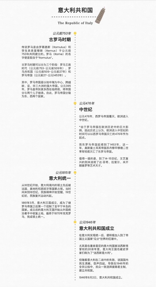 谈及意大利的历史,可以用“盛极一时”和“诸侯割据”来形容。其辉煌之处在于这里是古罗马文明的发源地。然而,随着罗马帝国的陨落,意大利被“各路豪强”瓜分,形成了百余个独立的国家。这片土地上从此战火不断,一直到19世纪意大利复兴运动(1815-1870年)兴起,撒丁王国开始逐步统一南北,1861年建立意大利王国,1870年攻克教皇国首都罗马,完成意大利统一。而随着二战战败,意大利废除了君主制,于1946年6月2日成立意大利共和国。