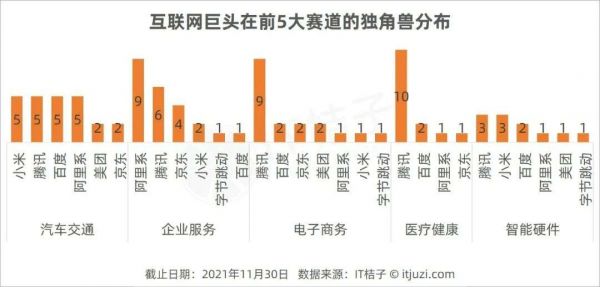 据统计,2021 年中国 295 家独角兽公司中,有 59 家背后有腾讯投资的身影,31 家有阿里系身影,小米和百度分别有 20 家和 19 家,依次排在腾讯和阿里之后;京东参投的独角兽有 14 家,排在第 5;之后分别为美团和字节跳动,其拥有独角兽企业数量分别是 10 家和 5 家。