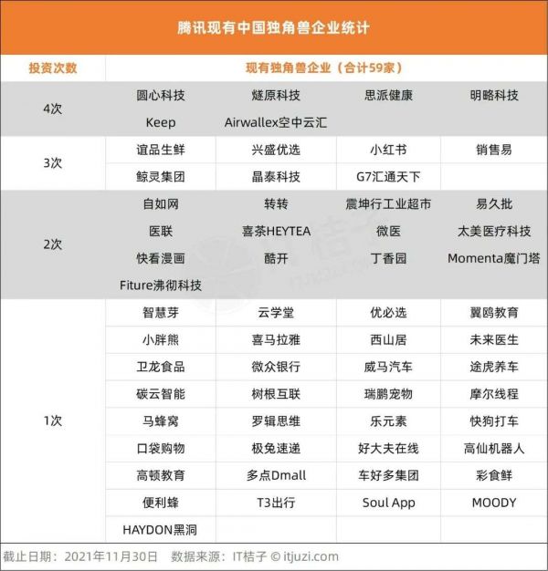 另外,腾讯 2 次参投自如网、转转、医联、微医等 14 家企业,同时也是智慧芽、云学院等的参投方。