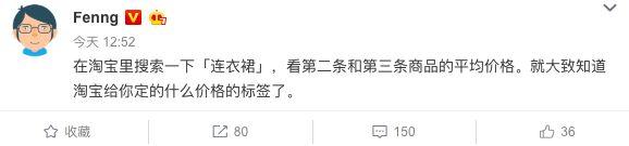 而按照冯大辉(@Fenng)的说法,你只需在淘宝里搜索“连衣裙”这个关键词,看第二条和第三条商品的平均价格,就大致能知道淘宝给你定的标签属于什么价格区间了。
