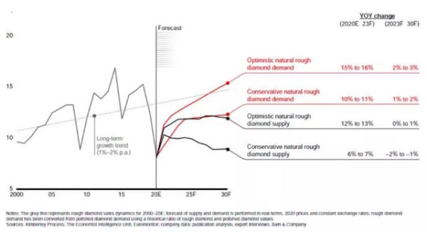 供给方面,2017 年以来全球毛坯天然钻石产量持续下滑,中长期供给不足趋势或将持续。全球毛坯钻石产量在 2017 年达到近 10 年高点,为 1.51 亿克拉,之后连续三年呈现下降趋势,2020 年在新冠疫情冲击下产量同比大幅-20.14%至 1.11 亿克拉。据贝恩咨询预测,乐观情况下,未来 10 年全球天然钻石产量将以 0%~1%增速缓慢增长,悲观情况下则将以-2%~1%增速下滑。目前人造钻石渗透率较低,但增速可观,中长期成长潜力巨大。在天然钻石供给持续承压的背景下,人造钻石逐步开始对天然钻石的替代进程。
