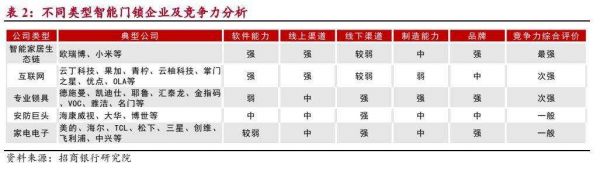 今年,萤石网络推出了一款DL31FVS人脸识别智能可视门锁,实现了对门锁、猫眼、门铃和摄像机功能的集成,根据招商银行研究院的研究,萤石网络在智能门锁的整体竞争实力仅为一般。