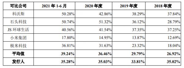 从衡量公司产品竞争力和盈利能力的直接指标毛利率来看,2018年至2021年上半年,萤石网络的主营业务毛利率分别为35.02%、33.81%、35.03%和 35.28%,整体变动不大。而同期,同行业可比公司毛利率平均值分别为26.92%、29.79%、36.46%和39.24%,保持较快增长。