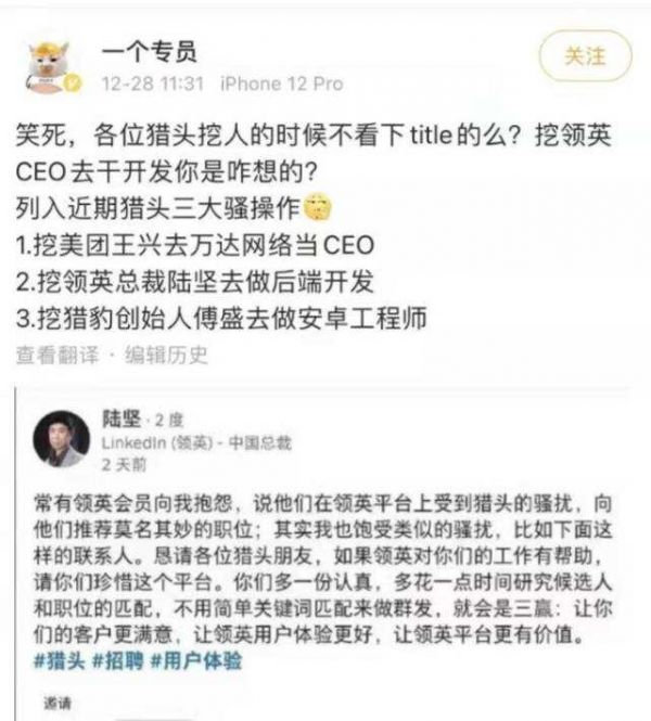 有网友在微博发文曝出,全球最大的招聘社交平台领英的猎头竟然要挖自家老总去干后端开发。领英的猎头“嚣张”还不止于此,根据网友曝料,领英猎头还准备挖美团的王兴去万达网络当CEO;挖猎豹创始人傅盛去做安卓工程师。