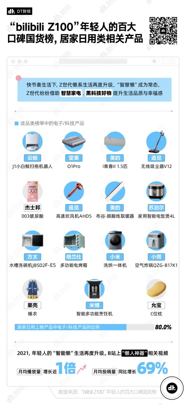 在B站Z100年轻人的百大口碑国货榜中,居家日用类的的高赞物品占据17.6%,其中出现了不少以智能、全自动为主打的产品。比如能完成基础清洁的扫拖一体机,完成清扫的同时又完成了拖地。