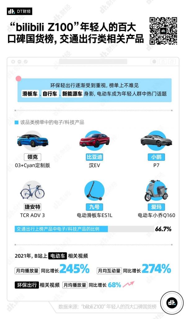 所以,“轻出行”逐渐受到年轻人的重视。在这次的榜上,我们不难见到滑板车、自行车、新能源车的身影,电动车也成为年轻人群中热门话题。2021年,B站上电动车相关视频月均播放量同比增长245%,月均互动量同比增长274%;环保出行相关视频月均播放量同比增长68%。