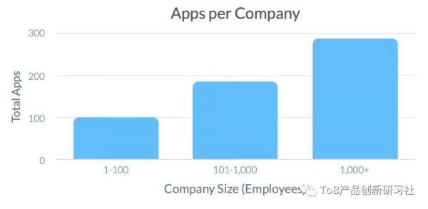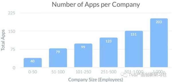 在 2010 年起,软件使许多用户的购买决策民主化。在这里,您可以看到员工或团队选择自己的软件产品的民主化和自由化反映在每个公司使用的应用程序数量的增加上。
