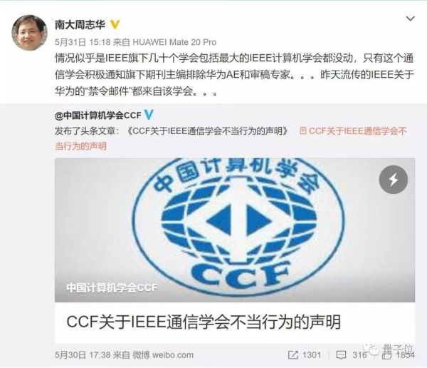 5月30日,IEEE发表声明的当天下午,中国计算机学会(CCF)发表声明称,对IEEE旗下的通信学会“日前要求禁止来自华为的员工参加审稿等学术评价活动”行为表示遗憾,决定: