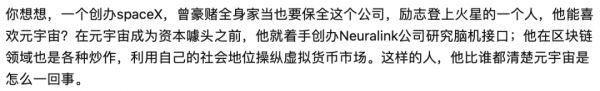 但是网友Moye表示,这么一个励志要上火星、重金研究脑机接口以及在NFT上左右横跳反复收割的人,对元宇宙这事必然是「门儿清」的。