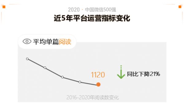 根据新榜发布的《2020中国微信500强年报》,统计过去 5 年的活跃样本(即有监测发文的公众号,含时事政务)的阅读数,单篇文章的平均阅读数持续走低,5 年内降幅达 69.9%(由 2016 年的单篇 3719 个阅读降至 1120)。