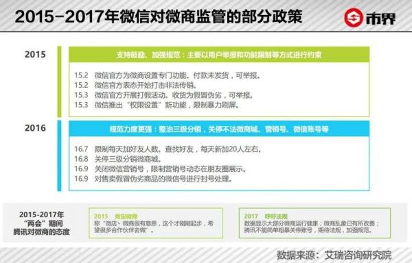 同时,各方面对于微商的监管也开始加速。 2015年,工商总局首次明确提出将微商纳入监管;微信官方对微商的政策也从鼓励转变为严肃监管,从“打假活动”、限制暴力刷屏到后来限制每天加好友人数、关停三级分销微商城、关闭微信营销号等等;2017年,微商法律规范征求意见稿公布。