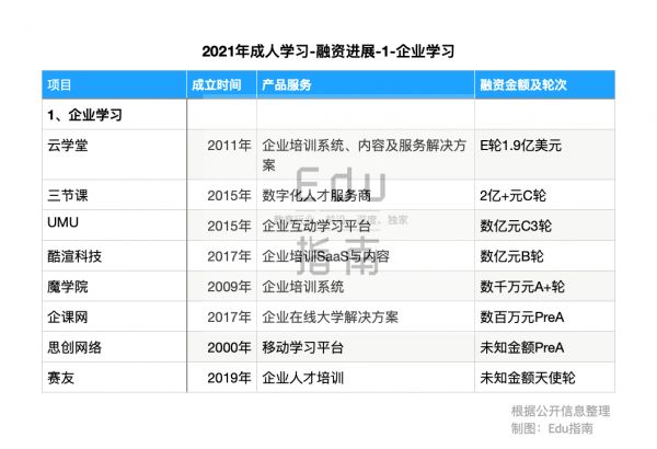 2021年成人学习市场,最受关注的无疑是ToB的企业学习公司,这类公司为企业职员提供在线学习系统、培训内容以及整体解决方案。