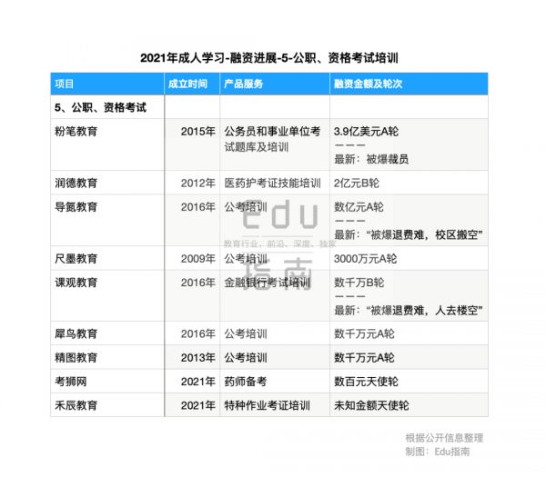 体制内职业与资格考试培训,2021年不乏获得高额融资,同时,另一个消极的表现是,多家获投公司被爆裁员与拖欠资金、难退费。这是其他成人学习类别头部公司今年少有披露的负面进展。