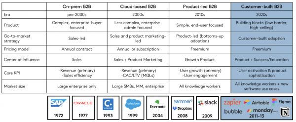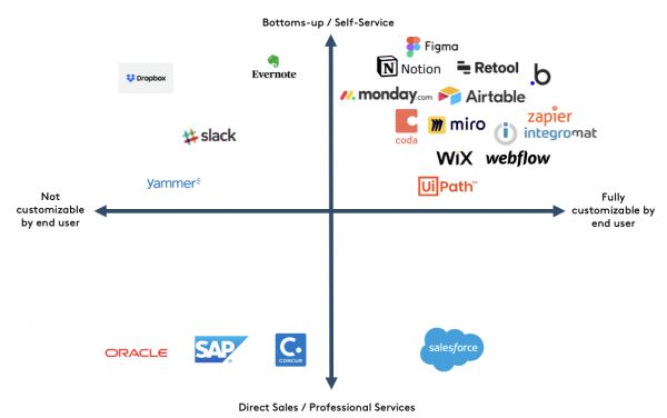 但最新一批快速增长的企业软件公司则不一样,他们通过设计让最终用户可以自行开发解决方案(又名“无/低代码”)的产品,并且利用这种真诚的布道,进一步推动了产品驱动增长。这种产品设计与进入市场的策略,我称之为“客户开发驱动增长”(customer-built growth),为企业软件世界的新进入者提供了巨大机会。