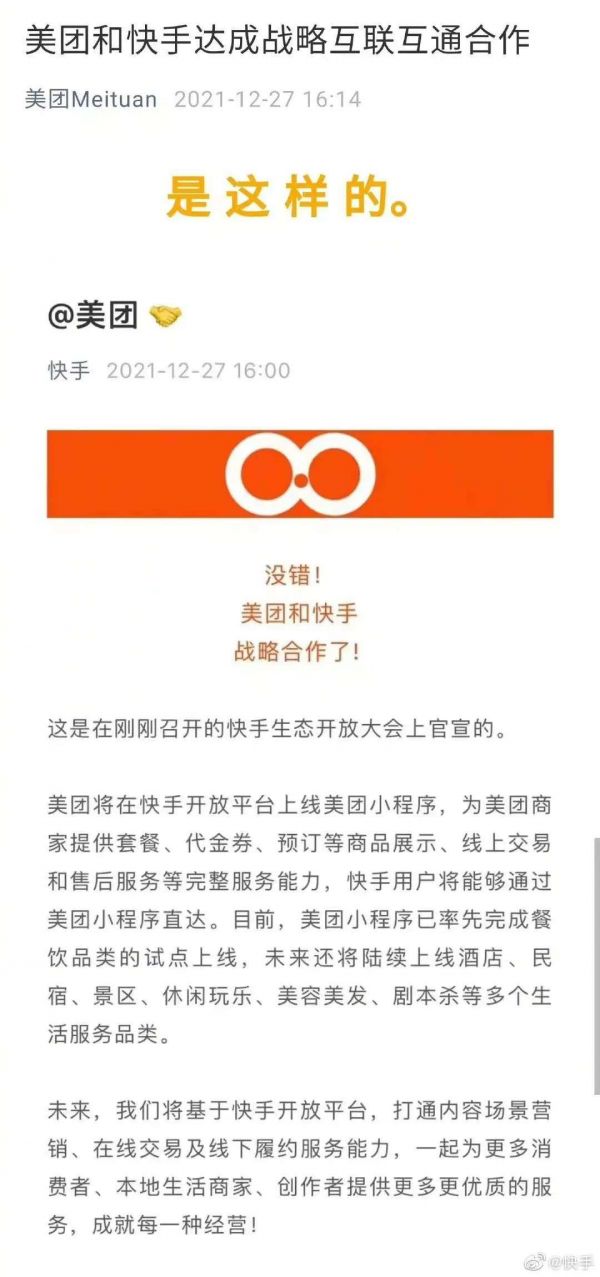 继微信开放外链后,“互联互通”又有了新一步进程。12月27日,快手与美团宣布达成互联互通战略合作。双方将基于快手开放平台,打通内容场景营销、在线交易及线下履约服务能力,共同为用户创造“一站式”完整消费链路。