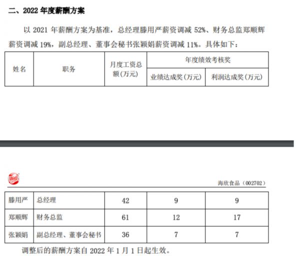 鉴于此,公司根据目前经营实际情况制定了2022年高级管理人员薪酬方案。具体降薪措施,以2021年薪酬方案为基准,实控人之一、总经理滕用严薪资调减52%,财务总监郑顺辉薪资调减19%,副总经理、董事会秘书张颖娟薪资调减11%。三人的月薪总额(12个月),调整后分别为42万元、61万元和36万元。调整后的薪酬方案自2022年1月1日起生效。