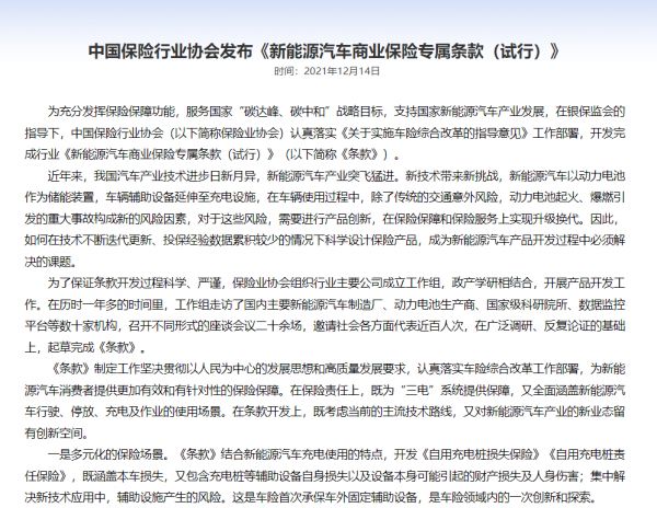 本月中旬,中国保险行业协会在其官网发布了《中国保险行业协会新能源汽车商业保险专属条款(试行)》的通知,通知表示在保险责任上,该条款既为“三电”(电池、电机和电控)系统提供保障,又全面涵盖新能源汽车行驶、停放、充电及作业的使用场景。