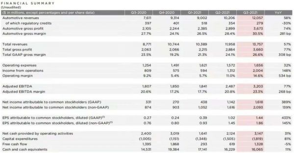 特斯拉2021年Q3部分财报数据,截图自财报