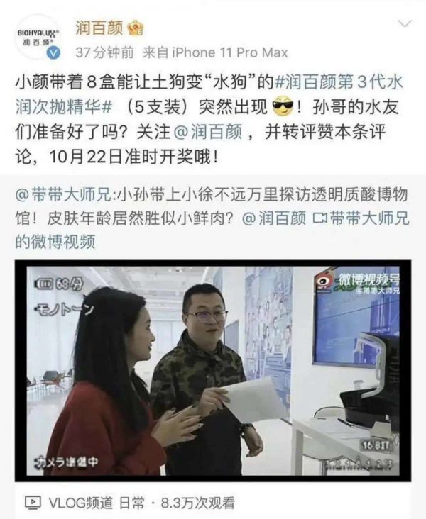 双11前夕,华熙生物旗下的润百颜官方微博转发了网红“带带大师兄”孙笑川探访润百颜透明质酸博物馆的视频,并称其产品“能让土狗变‘水狗’”,很快引得舆论哗然。一方面,网红孙笑川及其自称“狗粉丝”的追随者曾有过多次攻击女性的不当言论,其网络形象颇有争议;另一方面,润百颜文案中的“土狗”等词涉嫌歧视消费者。
