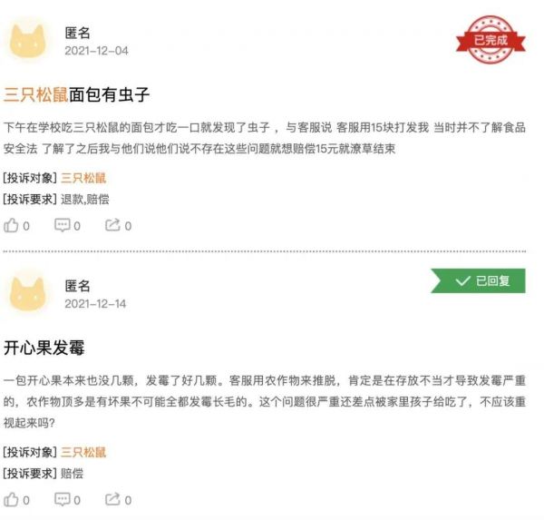 消费者针对三只松鼠的投诉
