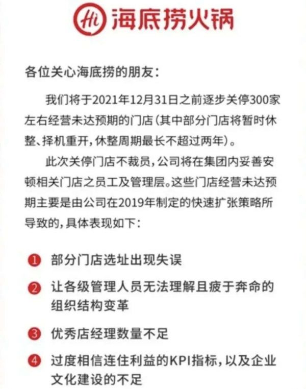海底捞关店公告 来源 / 微博