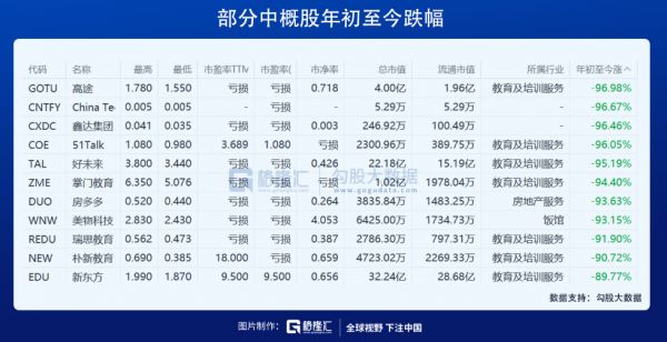 双减政策出台后,K12教培机构的业务空间几乎被完全限制,在线教育板块股价集体下挫。高途、好未来、新东方等中概股公司市值不断缩水。截止今日,高途股价累计下跌96%,好未来下跌95%,掌门教育下跌94%,新东方下跌89%。