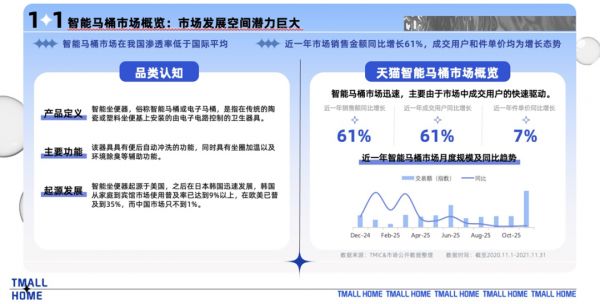 公开数据显示,2021年,日本智能马桶普及率超过80%,而中国市场渗透率尚不到5%,这无疑给了商家更大的想象空间。近年来,无论是传统卫浴行业还是快速崛起的新锐品牌,都在不断加码智能马桶领域的布局。《白皮书》显示,2020年天猫智能马桶市场增长迅速。近一年,销售额同比增长61%,成交用户同比增长61%。