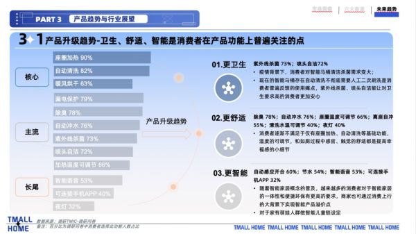 近日,天猫家装行业联合天猫新品创新中心(TMIC)、好好住家居研究院发布了《智能马桶行业趋势洞察白皮书》(下称《白皮书》),通过淘系丰富的大数据和精准的消费者反馈,挖掘出抗菌、自动感应、绿色节能、AI 语音、壁挂及外观设计六大趋势赛道,以及背后的核心人群研究。