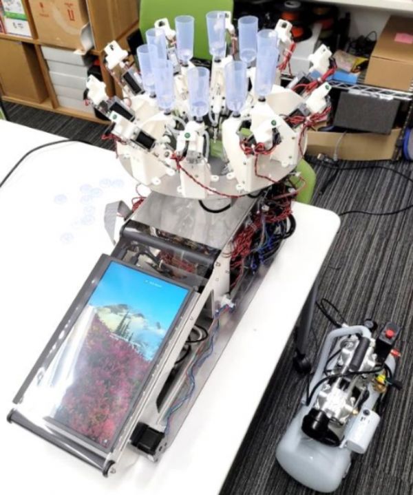 实际上,研究人员是将一个微型自动调味器安在了这颗大脑袋里面,装有不同液体的 10 个调料罐整齐排列,每个罐子背后安装有自动控制器,马达能够控制调料罐的送出和收回。
