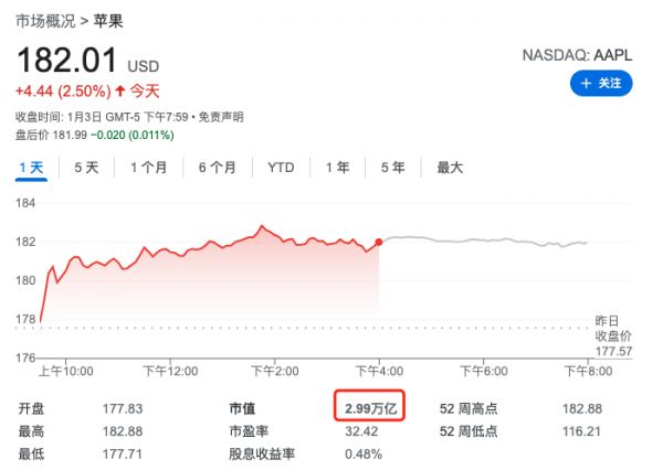 这一次,苹果仅用了一年的时间,在 2022 年新年伊始,于周一(1 月 3 日)突破 3 万亿美元的大关,成为美股史上第一家突破 3 万亿美元的公司,不过值得注意的是,这一次仅是苹果短暂地达到了 3 万亿美元的市值,因为不久之后,苹果市值有所回落,当前为 2.99 万亿美元,距离 3 万亿美元仅一步之遥。