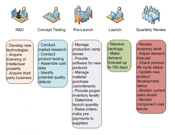 此前,苹果公司 2011 年的年度报告(sec文件)曾分享了其供应链的简化模型,覆盖研发、概念测试、试用、正式发布、季度考核等多流程: