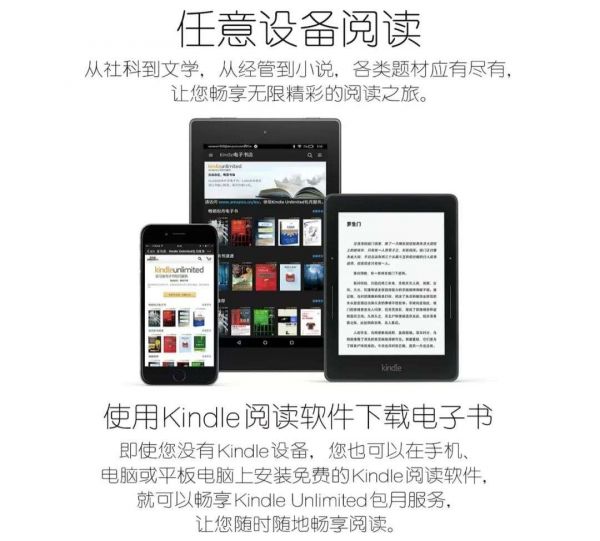 亚马逊电子书并不仅限Kindle设备阅览,用户购买电子书后,也可使用手机和平板电脑进行阅读,这是为了部分愿意购买亚马逊电子书,但是不愿意购买Kindle的消费者们提供的折中选择。但这也成为了Kindle并非刚需的一大佐证。