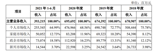 数据显示,2021年上半年,中国移动个人市场营收约为2555.45亿元,占主营业务收入的64.99%。2018年至2020年,该项目营收占比分别为75.78%、72.77%、68.56%。