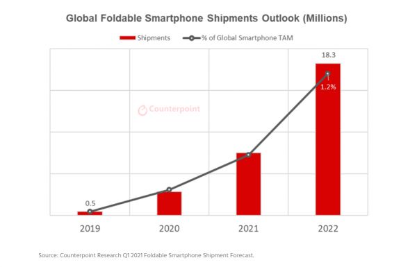 例如,权威机构Counterpoin根据目前折叠屏手机市场的环境,预测了2021-2022年折叠屏手机的市场占有率,预测数据表示,2021年市场占有率仍在0.1%以内,甚至经历数倍的高速增长至2022年,也仅在1.2%。