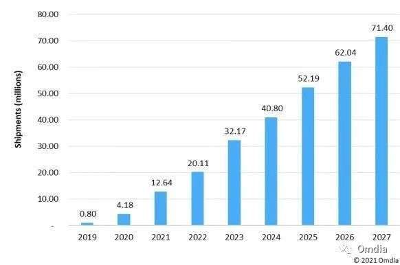 根据目前的调查,Omdia预测,折叠屏智能手机OLED显示屏出货量的CAGR将达到50%左右。2020年,出货量将达到400万片,到2027年,将超过7100万片。由此可见市场空间有多巨大。